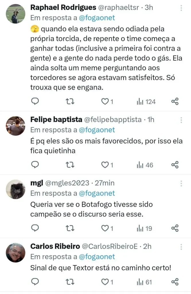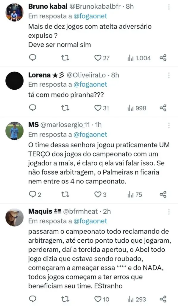 “Me causa estranheza porque eu acho que o proprietário está desequilibrado. O Botafogo liderando por tanto tempo o campeonato, dá todo esse problema, a turbulência e perder esse campeonato acho que o Textor ficou desequilibrado”, falou Leila após o Palmeiras conquistar o título.