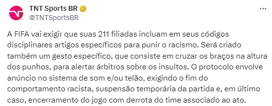 - Se o comportamento seguir, o árbitro determinará o fim do jogo, com derrota ao time associado aos atos racistas.