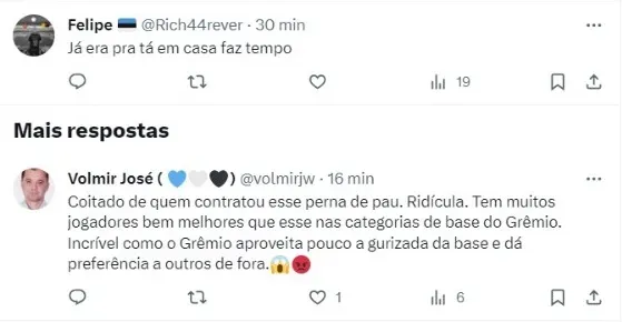 O jogador está emprestado do América-MG e tem contrato válido com o Grêmio até dezembro deste ano e, dificilmente, terá o seu vínculo de empréstimo renovado.