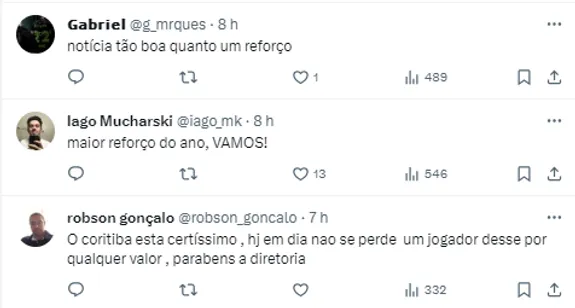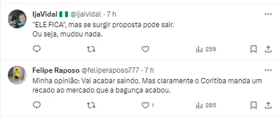 O GE questionou o clube sobre a situação do camisa 10 e um dirigente do Coxa foi firme em sua resposta: “Ele jogará conosco em 2024. (A negociação é) Página virada. Agora só compra nos valores que o Coxa quer”.
