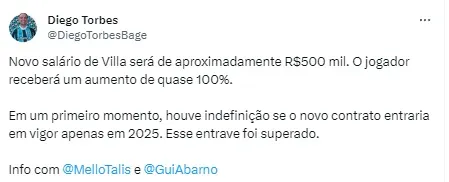 “Novo salário de Villa será de aproximadamente R$500 mil. O jogador receberá um aumento de quase 100%. Em um primeiro momento, houve indefinição se o novo contrato entraria em vigor apenas em 2025. Esse entrave foi superado”, completou Diego Torbes.