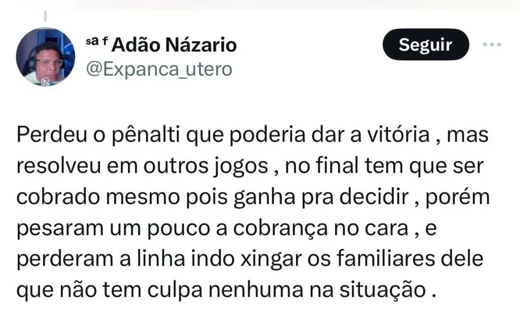 “Durante a partida de hoje, ela (minha namorada) xingada, assim como toda a minha família, por alguns torcedores. Fico triste e venho pedir respeito, pelo menos aos meus familiares”, disse Bruno, que continuou.