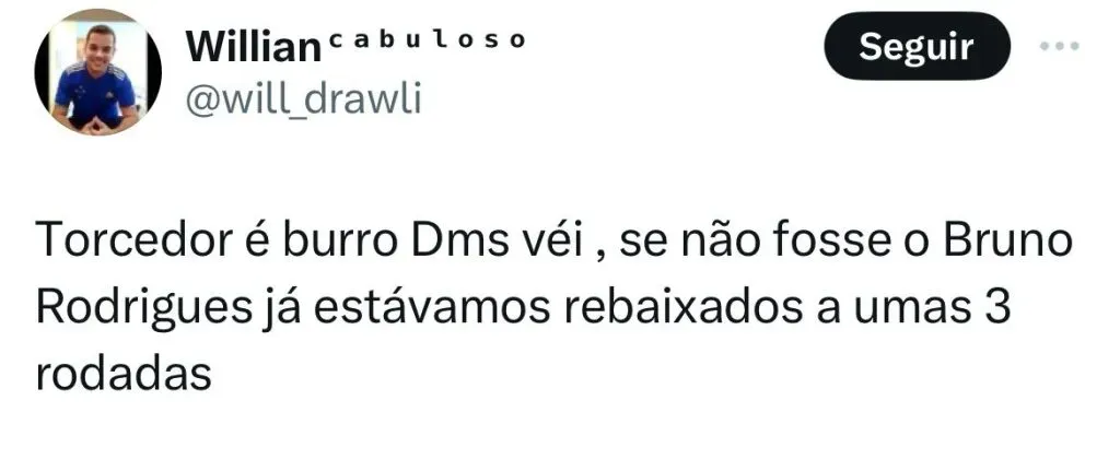 “Teve um torcedor que ficou xingando, falando um monte de coisa. Mas os de verdade me apoiaram”, disse Bruno Rodrigues que continuou contando detalhes da discussão com a o torcedor: