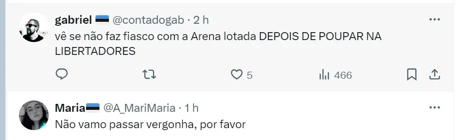 Na rede social, a torcida não gostou do resultado pela Libertadores e vê como obrigação o título estadual. Inclusive, os gremistas fizeram uma lista de dispensa com Nathan e outros nomes. Porém, o apoio no próximo sábado (6) vai ser incondicional durante os 90 minutos.