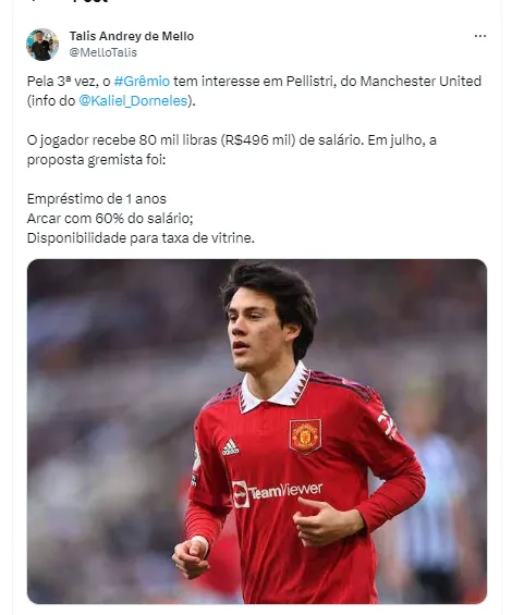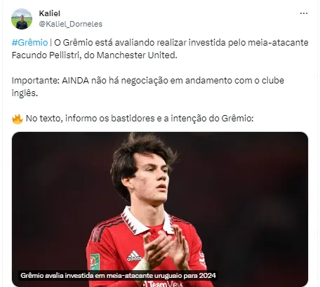“O Grêmio está avaliando realizar investida pelo meia-atacante Facundo Pellistri, do Manchester United. Importante: ainda não há negociação em andamento com o clube inglês”, informou o colega em suas redes sociais.