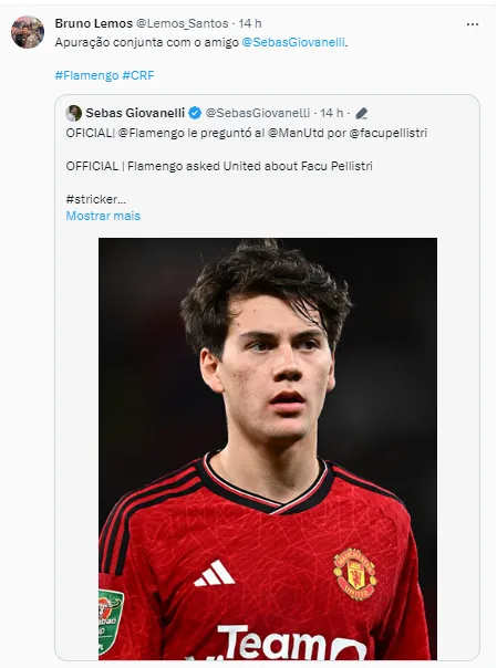 “Ainda sobre o Facundo Pellistri. Na era Bielsa da Seleção Uruguaia em um total de 8 jogos, o Pellistri foi titular em 6 partidas. Já no Manchester United está sendo muito pouco aproveitado”, publicou Bruno Lemos.