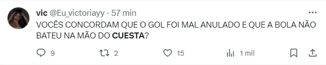 Nos acréscimos do primeiro tempo o Botafogo fez com Cuesta, mas teve o gol anulado após revisão do VAR, que segundo os profissionais da cabine, constataram um toque no braço do zagueiro antes da bola cair em seus pés e ele marcar o gol. Confira o lance no final da matéria.