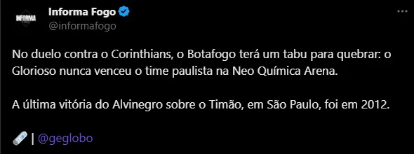 Para isso, todavia, os comandados de Bruno Lage vão precisar quebrar dois tabus impactantes. A última vitória do Fogão como visitante diante do Corinthians aconteceu em 2012, ainda no Pacaembu. Quer dizer, não bastasse o tabu, o Botafogo vai em busca de sua primeira vitória na história da Neo Química Arena, inaugurada em 2014. Até hoje, foram oito duelos no local, com cinco triunfos paulistas e três empates.