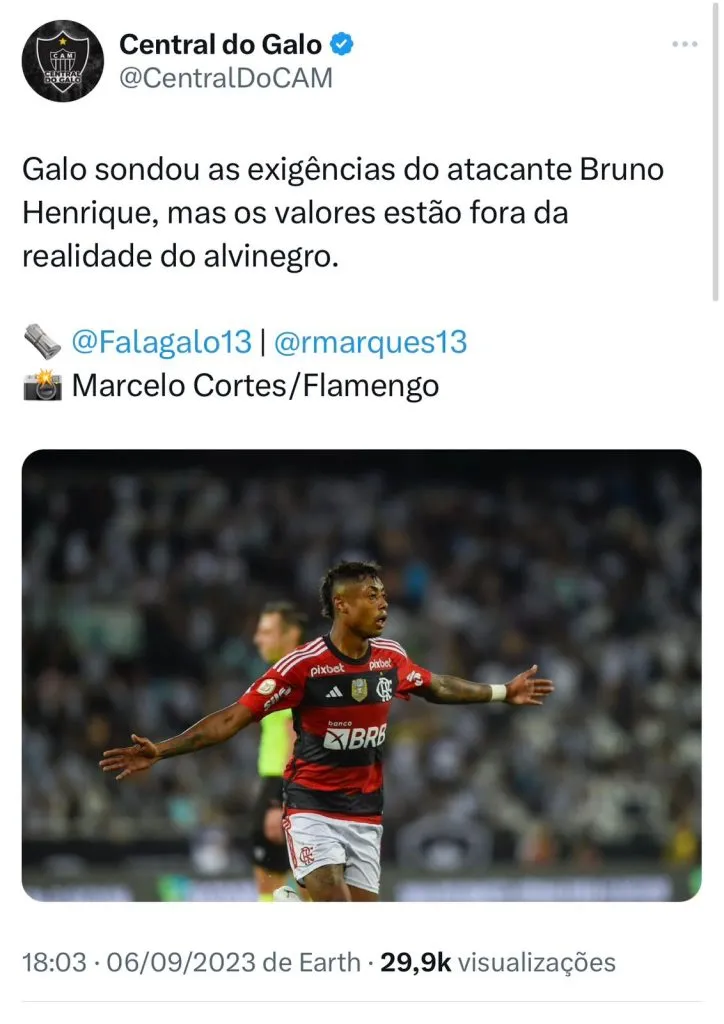Galo sondou as exigências do atacante Bruno Henrique, mas os valores estão fora da realidade do alvinegro. A informação foi divulgada primeiramente pela equipe de reportagem do Fala Galo. Quem não gostou muito da notícia foram os torcedores do Alvinegro que gostariam de ter o camisa 27 do Flamengo na equipe e deram dicas a Rodrigo Caetano de como trazer o jogador.