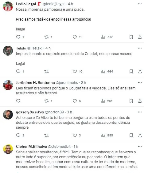“No futebol, se dá valor há algo que não existe. Quanto tempo você não via um Gre-Nal tão superior?”, concluiu Coudet. No entanto, Andrade declarou que a assessoria de imprensa do Inter tentava encerrar o debate e o argentino resolveu abaixar o tom da polêmica.