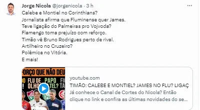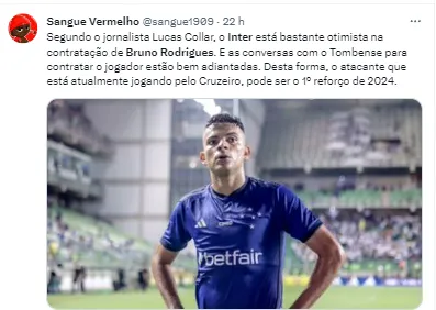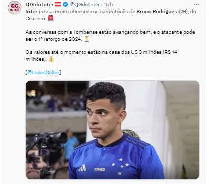 “O Corinthians procurou os representantes de Bruno Rodrigues para contratá-lo para 2024, mas ficou com a impressão de que chegou atrasado para fechar o negócio”, relatou o comunicador.