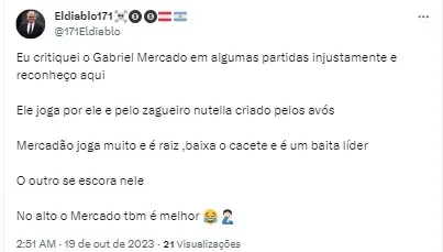 Mercado chegou ao Beira-Rio em 2021 e assinou por duas temporadas a pedido de Diego Aguirre. O defensor já participou de 86 jogos e balançou a rede em 4 oportunidades. 3 desses 4 gols foram anotados nesta temporada.