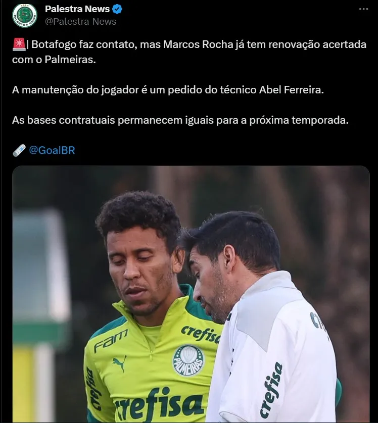Entretanto, conforme informações do portal GOAL, a diretoria do Palmeiras viabiliza uma renovação com o Marcos Rocha. A manutenção do jogador foi um pedido do técnico Abel Ferreira, entendendo a importância do jogador para o grupo. Mas, apesar da extensão do vínculo, a diretoria da equipe Alviverde não deve realizar nenhuma alteração de valores, mantendo assim tudo igual, estendendo apenas o período no Clube.