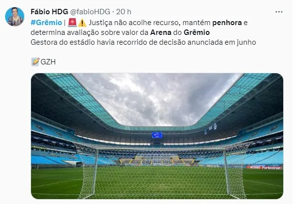 De acordo com as informações, a juíza Adriana Cardoso dos Reis, da 37 Vara Cível de São Paulo, a penhora foi mantida e o recurso solicitado foi negado. Parte dos valores que forem arrecadados na Arena Grêmio serão destinados para o pagamento destas parcelas atrasadas.