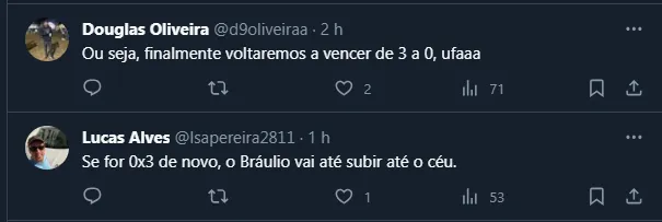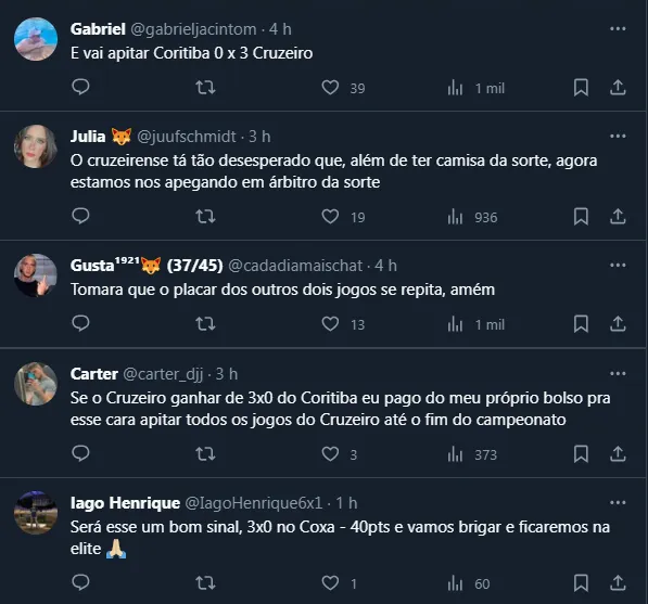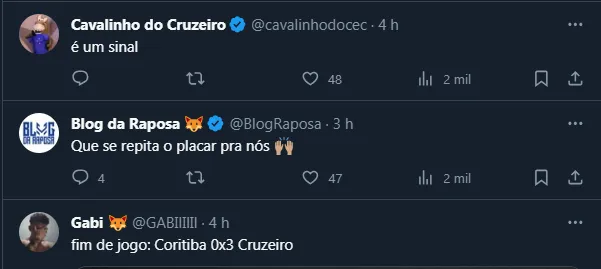 Ambos os jogos foram fora de casa e o Cruzeiro venceu por 3 a 0. Assim, diversos torcedores foram às redes sociais e manifestaram a esperança de mais um placar elástico diante do Coxa. O duelo será sábado (11), às 16h.