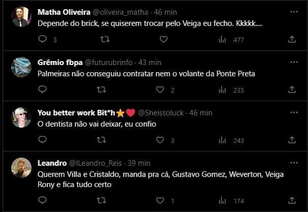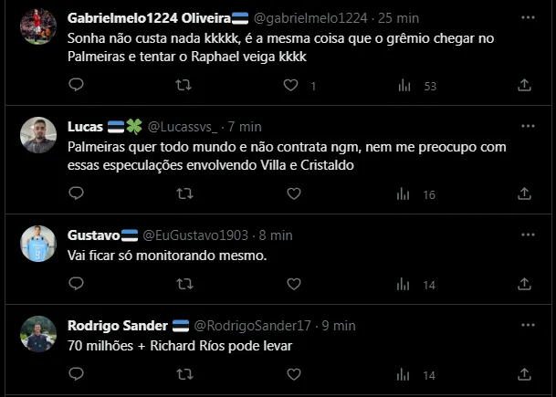O jogador é um dos grandes destaques do time e, na manhã deste sábado (23), surgiu a informação de que o Palmeiras está monitorando o jogador e quer contratá-lo para 2024. Com isso, o assunto chegou na torcida gremista e os tricolores tratam de “brincar” com o tema, propondo trocas e pedindo para o Clube não vendê-lo. Confira alguns comentários: