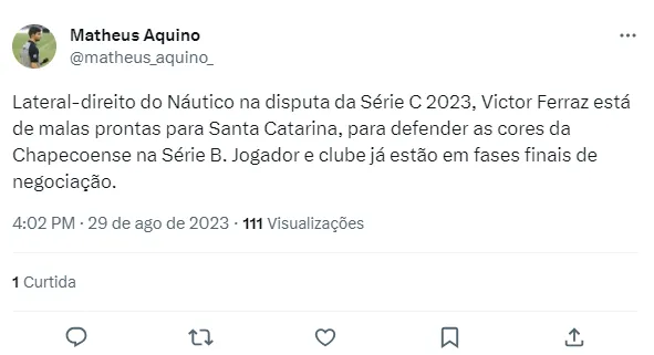 As conversas estão bem avançadas. Acredito que fecha hoje ainda”, disse o presidente do clube catarinense ao portal NE45. Desta forma, é certeiro que mais um jogador saia do elenco do Náutico na temporada.