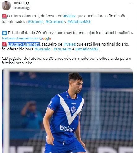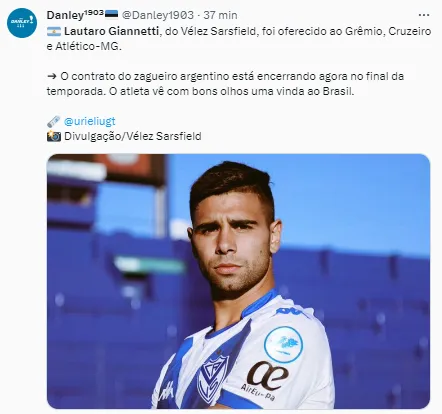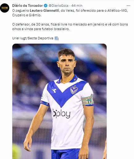 O zagueiro argentino também teria sido oferecido para os rivais mineiros. “Lautaro Giannetti, zagueiro do Vélez Sarsfield, da Argentina, que está livre no final do ano, foi oferecido para Grêmio, Cruzeiro e Atlético-MG”.
