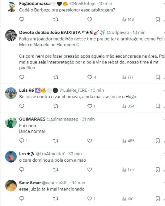 “Falta um jogador medalhão nesse time pra peitar a arbitragem, como Felipe Melo e Marcelo no Fluminense. Os cara nem pra fazer pressão após aquela mão escancarada na área. Por mais que seja interpretação por a bola vir de rebatida, nosso time é mt pacífico“, desabafou outro torcedor.