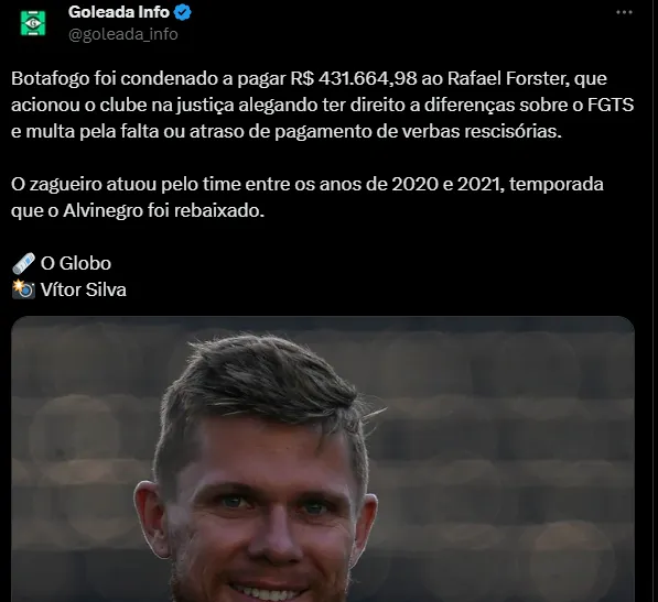 De acordo com o Blog do Ancelmo, do jornal O Globo, o Botafogo terá que pagar R$ 431.664,98 para Forster, que defendeu o Glorioso nas temporadas de 2020 e 2021, sendo titular principalmente na campanha do descenso para a Série B do Campeonato Brasileiro.