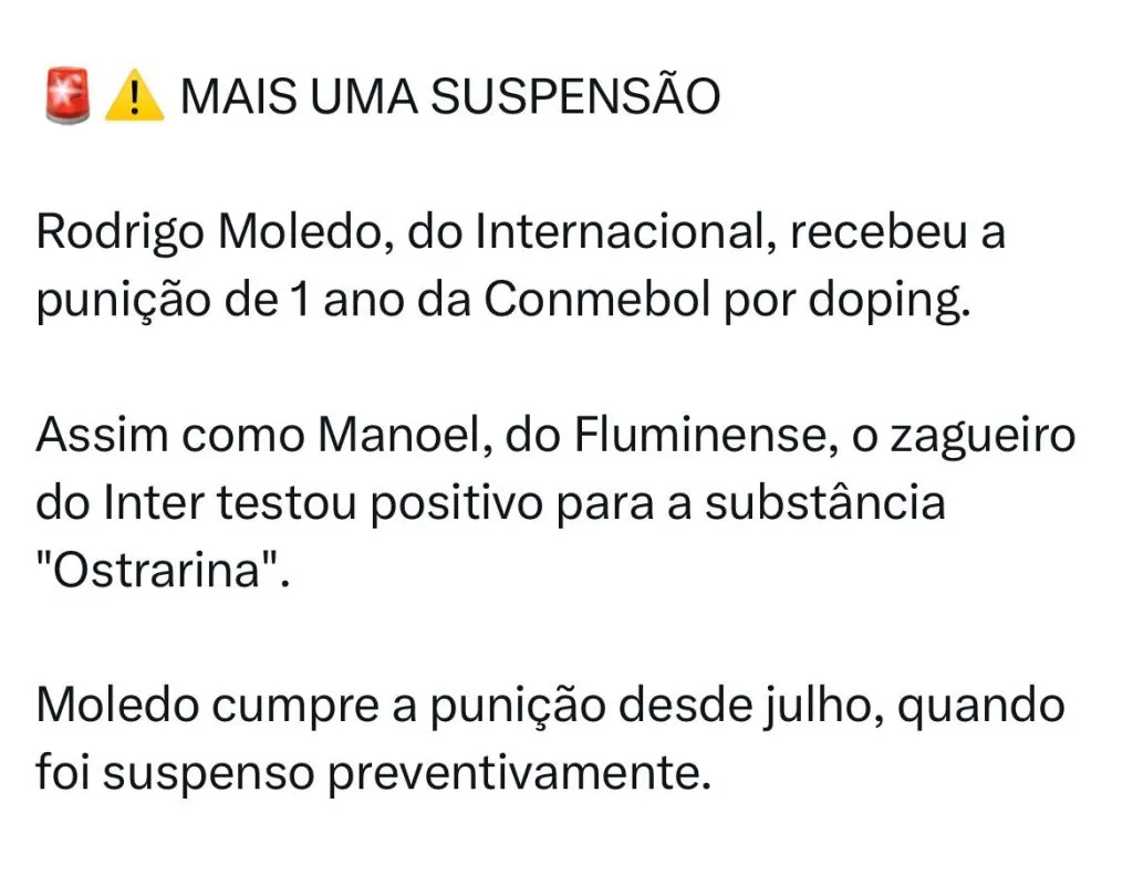 Aos 36 anos, o defensor foi punido pelo uso da substância ostarina em teste realizado pela Conmebol. Desta forma, o defensor está proibido até de treinar e usar as instalações do CT Parque Gigante e por conta disso só poderá voltar aos gramados a partir de julho.