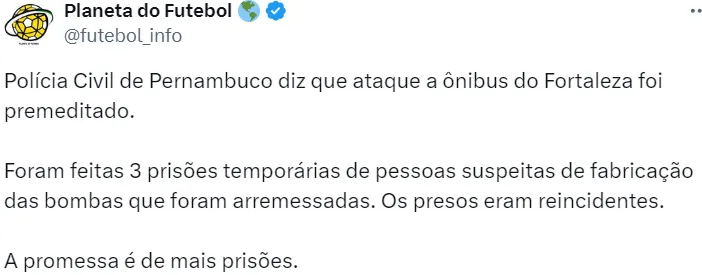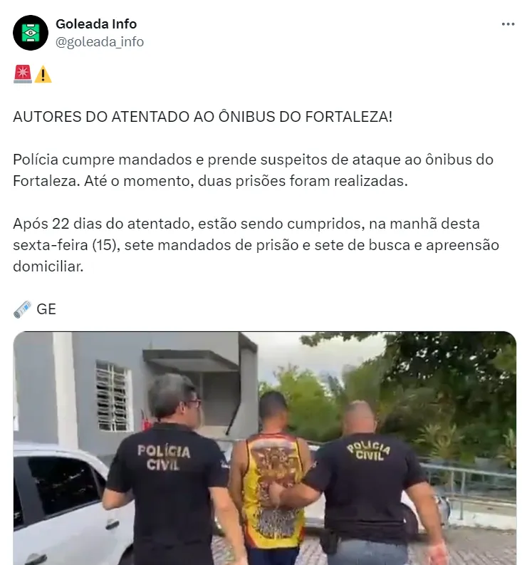 Na sexta-feira (15), a Polícia Civil de Pernambuco confirmou que o ataque contra o ônibus do Fortaleza foi realizado por membros da Torcida Jovem do Leão, identificada do Sport. Eles usaram bombas e pedras, após o empate em 1 a 1, pela Copa do Nordeste.