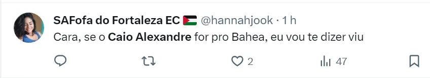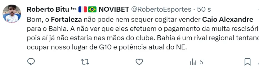 Com isso, a expectativa é que chegue uma oferta elevada do Bahia para o Fortaleza pelo volante Caio Alexandre. O Palmeiras, por sua vez, já esteve mais otimista em relação a essa contratação.