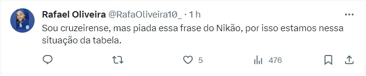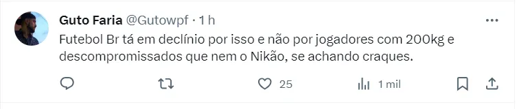 O camisa 10 não demonstrou desconforto apenas pela situação da equipe na tabela de classificação, mas pela postura que foi adotada pelo adversário. Nikão destacou que a partida foi um retrato do futebol brasileiro, que permite ‘atitude antidesportivas’.