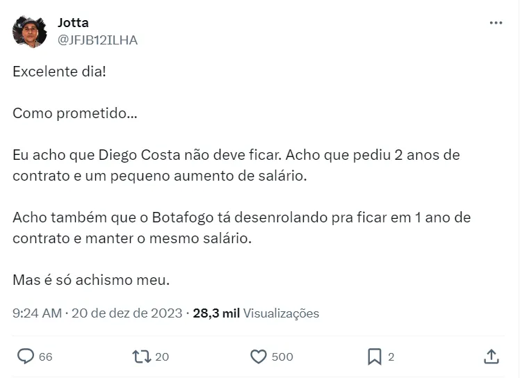 Apesar de não ter finalizado a temporada como gostaria, Diego Costa é visto como uma liderança nos bastidores e uma peça importante para o elenco no próximo ano. O jogador chegou ao Alvinegro com o aval de Bruno Lage, com quem já trabalhou no Wolverhampton.