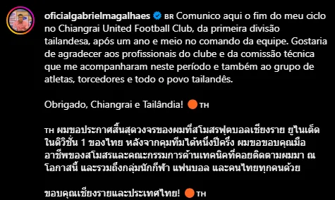 Na publicação, o treinador informou o fim da sua passagem pelo Chiangrai United e mandou o recado aos seus colegas de clube.