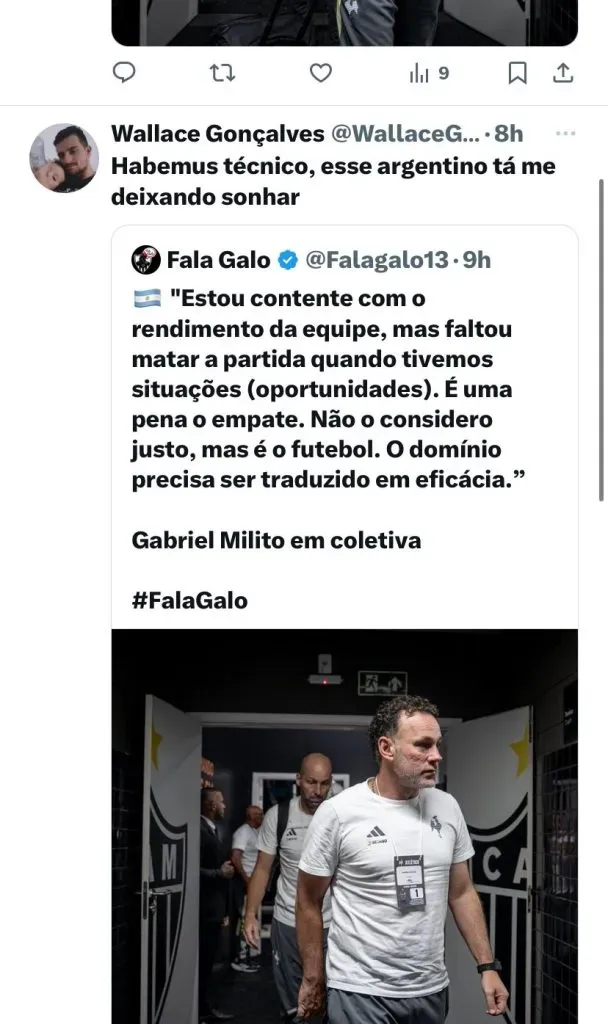 Em seu lugar, o argentino colocou Guilherme Arana, que iniciou o jogo no banco de reservas. Após a partida, em coletiva de imprensa, Milito não escondeu a frustração pelo empate: