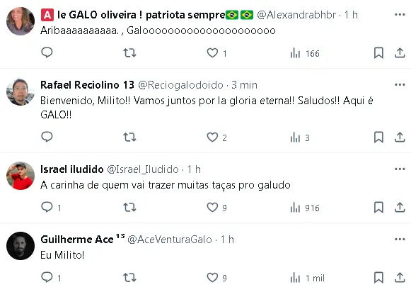 “Olá, Massa, sou Gabriel Milito. Queria dizer que estou muito feliz e emocionado por treinar o Galo. Um gigante do futebol brasileiro e da América do Sul. Estou seguro de que faremos um grande trabalho. Aproveito a oportunidade para felicitar o clube pelos 116 anos de história. Muitos êxitos. Para cima, Galo“, afirmou o novo técnico.