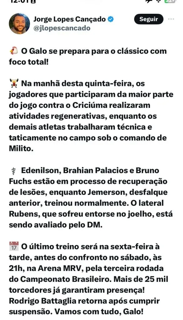 O jogo será válido pela 3ª rodada do Brasileirão, às 21h. Após empatar diante do Criciúma, na 2ª rodada, o argentino não aprovou o resultado, mas projetou como o Atlético chega para mais um duelo contra o maior rival.