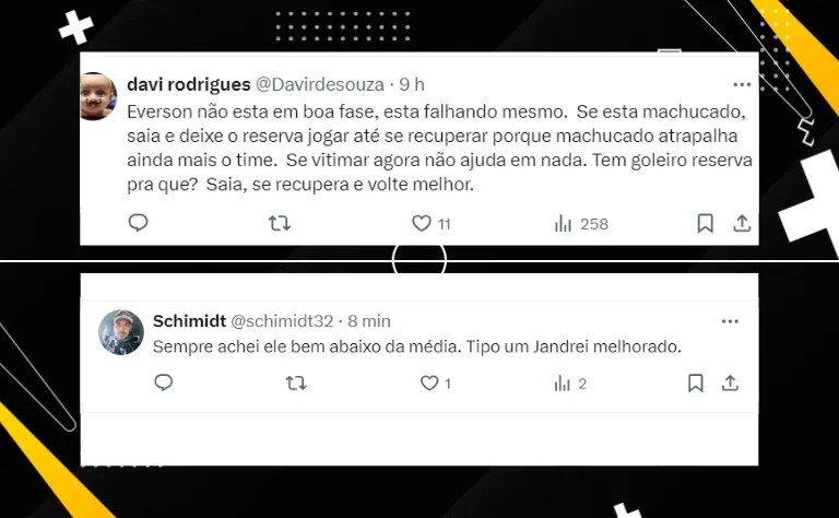 O goleiro Everson, um dos principais alvos da torcida que pedem a sua saída, não segurou a emoção após o confronto. O arqueiro desabafou sobre o momento e as cobranças que vem vivendo na equipe por parte dos torcedores diante do trabalho que vem sendo apresentado em campo.