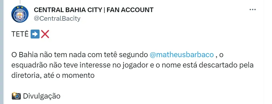 Por meio do Grupo City, o Bahia foi um dos times que mais contratou na janela de transferência. O Esquadrão Baiano se reforçou bem, especialmente no setor do meio-campo. Além disso, o meia Tetê teve o seu nome especulado no time de Salvador.