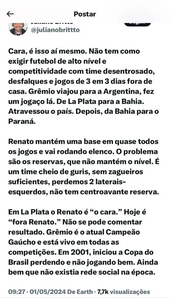 Além disso, Renato também falou sobre a sua escolha por Caíque e também da situação de Rafael Cabral. Agora, o Tricolor volta a jogar em casa, após dois jogos fora. No domingo (5), às 16h, contra o Criciúma, pela quinta rodada do Brasileirão.