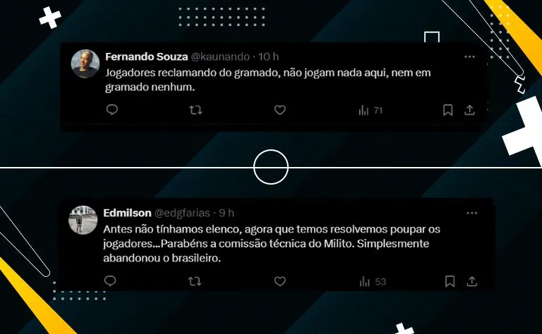 Outro fã fez um desabafo mais contundente: “Entregaram o Brasileiro pra disputar a Libertadores, e o Milito só inventa a cada jogo… Deus nos ajude, porque até hoje Milito não definiu um time titular e o gramado está pior que a Arena Jacaré!