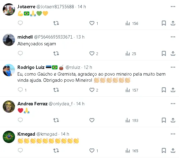Em uma publicação no Instagram, Galvão destacou o gesto solidário do clube e de sua torcida, que compareceu em peso à Arena MRV, em Belo Horizonte, na manhã deste sábado (11), para contribuir com doações aos gaúchos impactados pelas fortes chuvas.