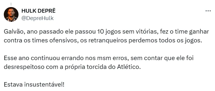 “Demitir um profissional dessa grandeza, que entregou tudo, que tem uma história no futebol mundial. Ele nem fala comigo desde 2024. Não sou amiguinho dele. Mas ele tem uma história no futebol mundial. Ele ganhou tudo. Foi pentacampeão. Demitir um técnico assim às vésperas da final do Campeonato Mineiro e a 15 dias da estreia na Libertadores, falta de respeito. Falta de respeito com o profissional. Acima disso, não dá para esperar as finais do Mineiro?”, indagou.