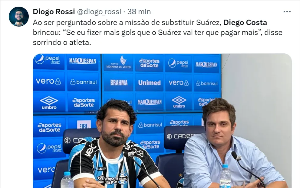 Há pouco, o centroavante Diego Costa foi apresentado oficialmente como novo reforço do Grêmio. O medalhão de 35 anos vinha livre no mercado e escolheu o projeto tricolor indicado por Renato Portaluppi.