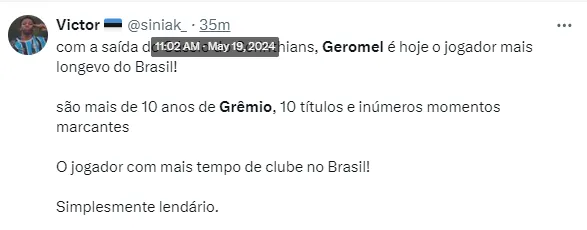 Com mais de dez anos de clube, o ídolo gremista nesta semana tomou o posto de Cássio como jogador que está há mais tempo num time do futebol brasileiro. O goleiro estava no Corinthians desde 2012, mas anunciou a saída do clube paulista.