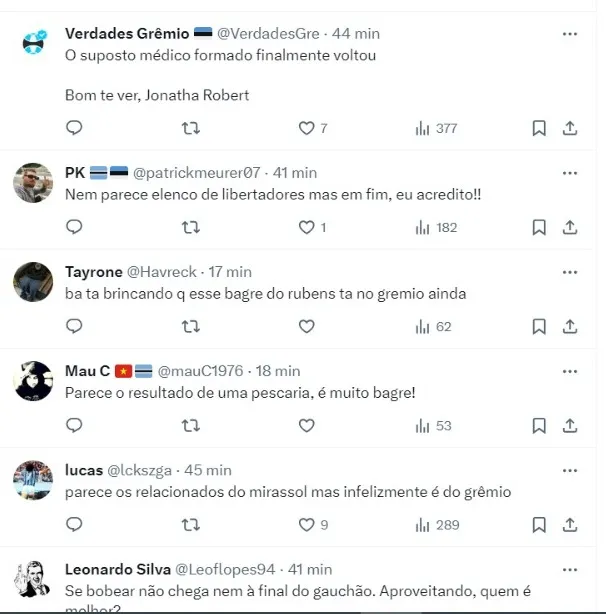 Lista de relacionados do Grêmio pro jogo de amanhã tem: Caíque, Marchesí, Grando, J. Pedro, Fábio, Wesley, Reinaldo, Rodrigo Ely, G. Martins, Bruno Uvini, Natã, Villasanti, Pepê, Dodi, Jhonata Robert, Nathan, Cristaldo