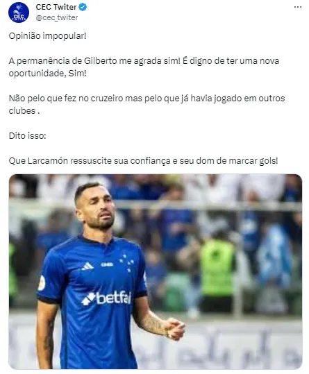 Porém, conforme informações publicadas pela equipe de reportagem do site O Tempo, Gilberto não está nos planos do técnico argentino para a atual temporada, em que o time celeste vai disputar o Campeonato Mineiro, a Copa do Brasil, o Brasileirão e a Sul-Americana.