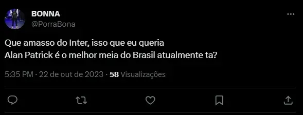 “Que amasso do Inter, isso que eu queria Alan Patrick é o melhor meia do Brasil atualmente ta?”, “Alan Patrick merece o MUNDO”, “Alan Patrick é gigante” e “Sou muito feliz de ter o prazer de assistir minha camisa 10 ser usada por Alan Patrick. Que jogador fantástico, craque”, foram alguns dos comentários dos colorados nas redes sociais.