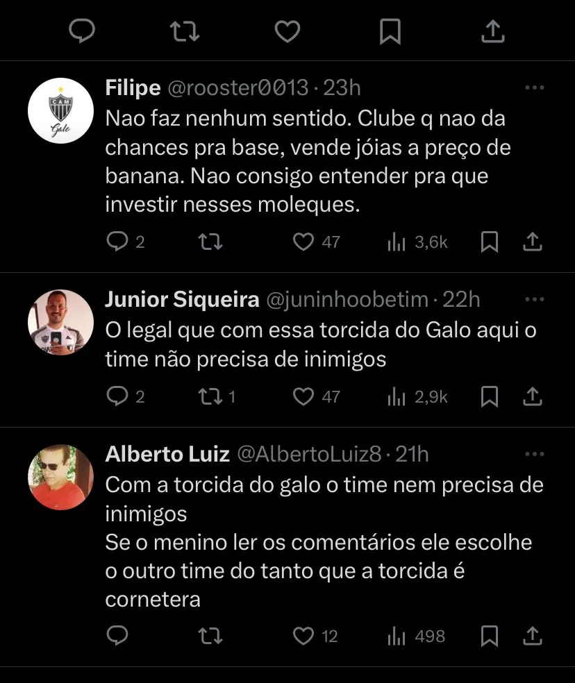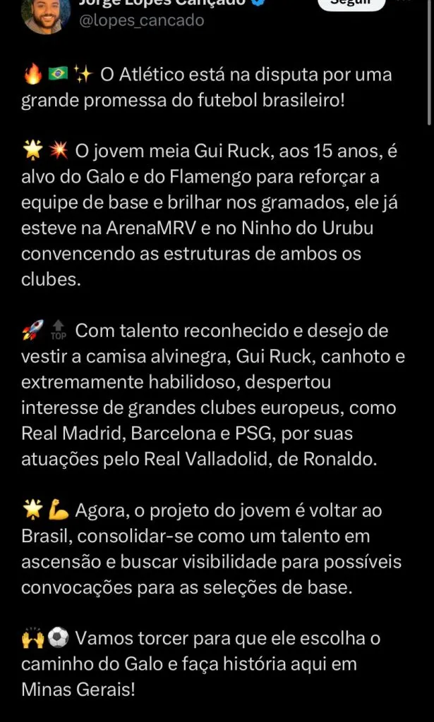 Após Savinho voltar a ser pauta no Galo, foi trazido pelo GE, que o Galo está de olho em uma jovem promessa de 15 anos, meio-campista e que atuava pelo Real Valladolid, clube de Ronaldo Fenômeno, CEO do rival Cruzeiro.