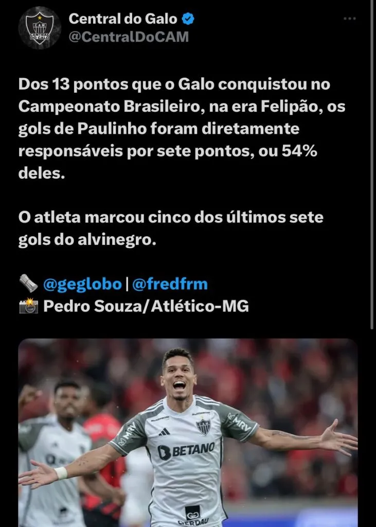 Com 19 gols na temporada, sendo 8 pelo Brasileirão, Paulinho vem sendo um ‘salvador da pátria’ do Atlético na era Felipão. Dos 13 pontos conquistados pelo time mineiro desde que o treinador assumiu, os gols do camisa 10 foram diretamente responsáveis.
