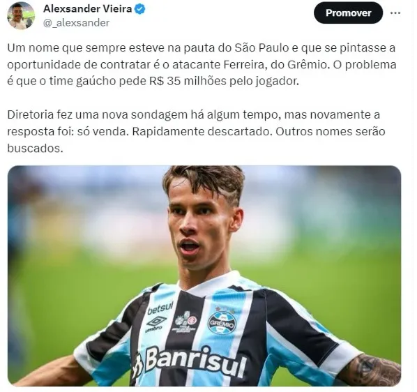 Um nome que sempre esteve na pauta do São Paulo e que se pintasse a oportunidade de contratar é o atacante Ferreira, do Grêmio. O problema é que o time gaúcho pede R$ 35 milhões pelo jogador, que não faz parte dos planos do Imortal para a próxima temporada.