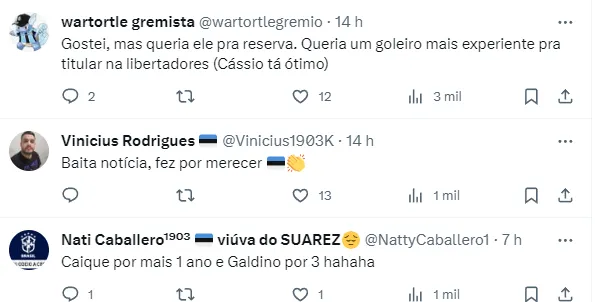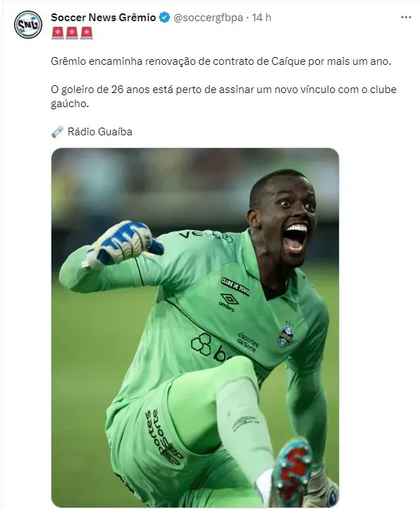 Internamente, ele é bem avaliado e seria uma opção para compor o elenco em 2024 para a posição de goleiro. Ele tem 26 anos, não seria uma opção cara para compor o plantel gremista e pode ter seu contrato renovado, segundo Jeremias Werneck.