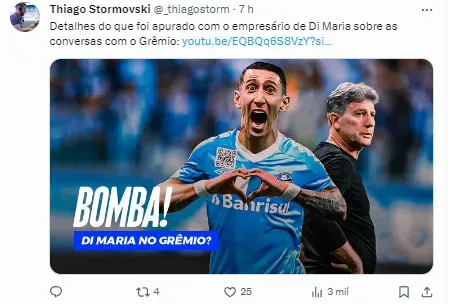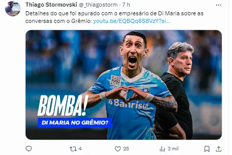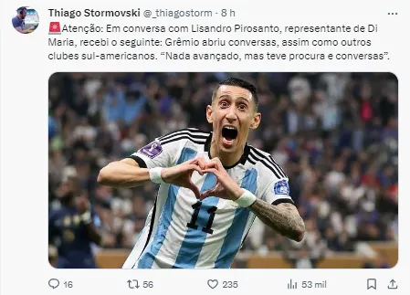 “Em conversa com Lisandro Pirosanto, representante de Di Maria, recebi o seguinte: Grêmio abriu conversas, assim como outros clubes sul-americanos. ‘Nada avançado, mas teve procura e conversas”‘, publicou o comunicador em suas redes sociais.