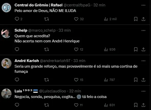 “A partir de agora, se vai evoluir, se o Grêmio vai demonstrar interesse, se vai tentra alguma coisa, a partir disso, eu não tenho como dizer. O ponto é que o Grêmio sentiu a pressão, sabe que precisa trazer alguém de nome e o Grêmio aumentou a possibilidade de investimento”, detalhou.